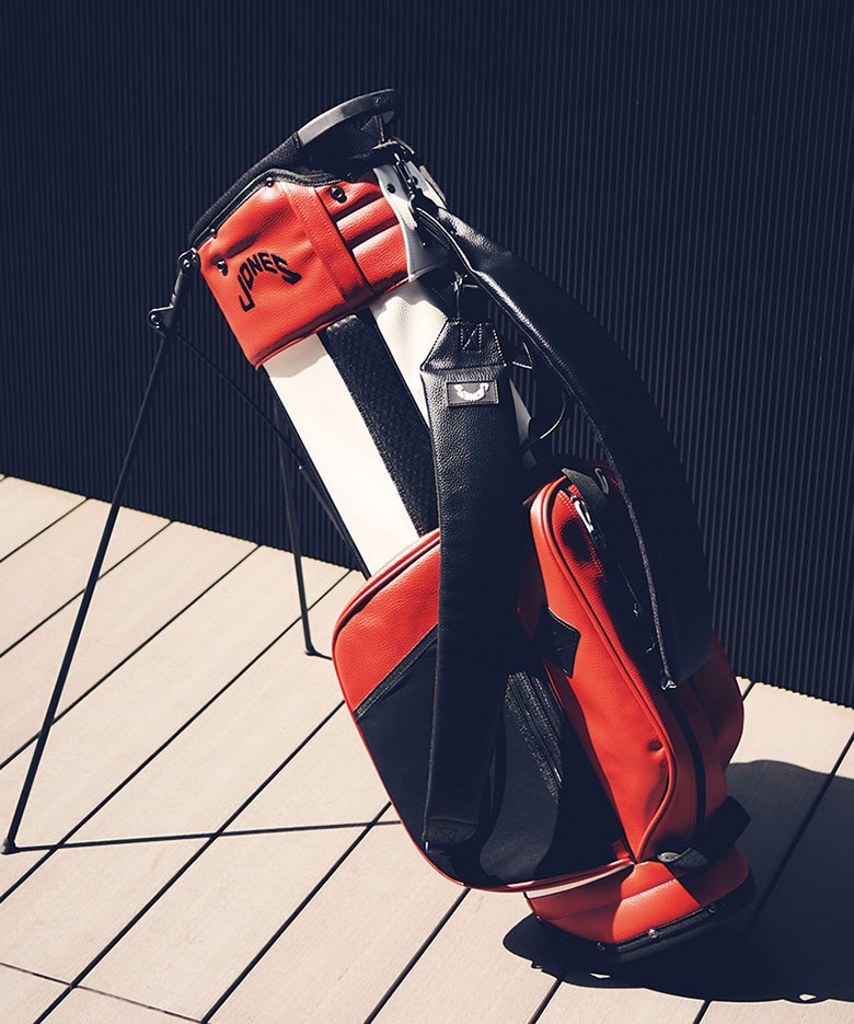 ビームス ゴルフがジョーンズ スポーツに別注したキャディバッグ。某ヴィンテージスニーカーのカラーリングなのだとか。スウェットは1990年代のラルフ ローレン。ツータックのチノパンはクラシックな顔つきですが新品で、ストレッチ素材の優れもの。ビームス プラスのオリジナルですね。