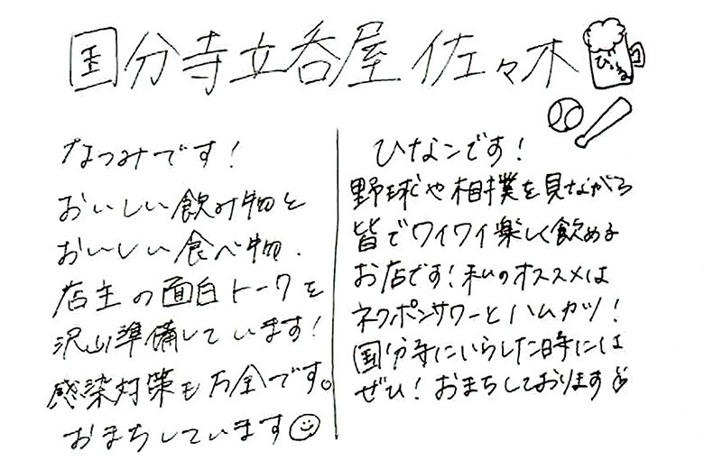野球の試合を観ながら生ビール……早く実現しますように。 【取材協力】立呑屋 佐々木住所:東京都国分寺市南町3-4-15 泊第一ビル2F電話:042-201-8993https://twitter.com/kagurasasaki「看板娘という名の愉悦」Vol.155好きな酒を置いている。食事がことごとく美味しい。雰囲気が良くて落ち着く。行きつけの飲み屋を決める理由はさまざま。しかし、なかには店で働く「看板娘」目当てに通い詰めるパターンもある。もともと、当連載は酒を通して人を探求するドキュメンタリー。店主のセンスも色濃く反映される「看板娘」は、探求対象としてピッタリかもしれない。