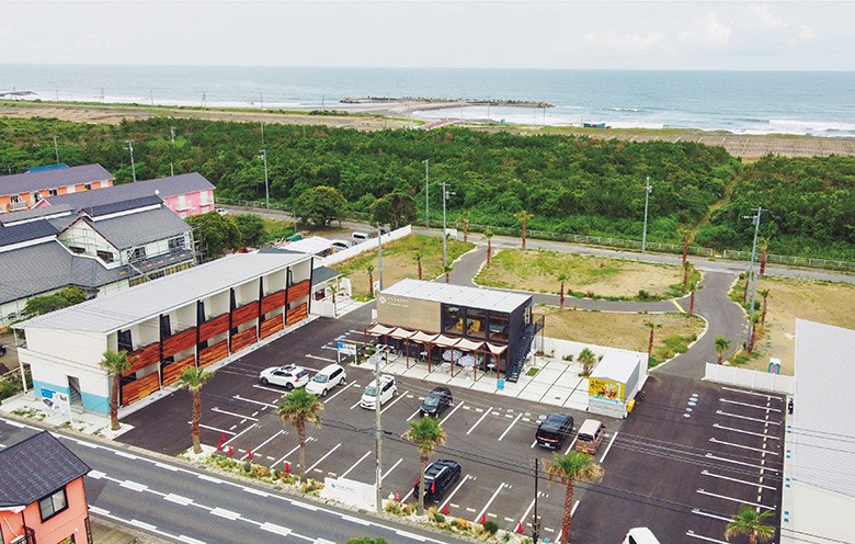 駐車場のあるシックな建物が「クラブハウス」で背後の芝生エリアが分譲地。両サイドには賃貸用アパートメントが建ち、防砂林の向こうは海。グッドウェーブが炸裂する。波までが我が家です。そう言い切れるほどに海に近い「パラソル」は、カフェやボードラックなどのサービスを揃え、ビジターも利用しやすい最新ランドマーク。