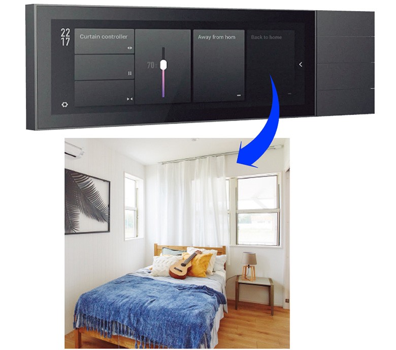 「寝室のカーテンを70%開ける」と設定。すると、サーッとカーテンが開いていった。