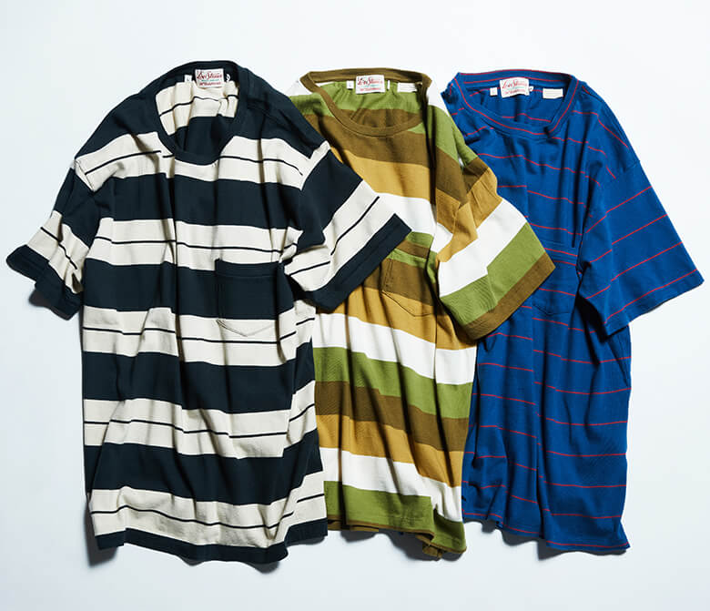 なかでもこのレトロサーフな空気感がたまらないマルチボーダーTなんて、海好きやアメカジ好きにとっては大好物そのもの。実際、このマーシーの着こなしはどうか。まるで昔から愛用していた私服のようなハマり具合である。