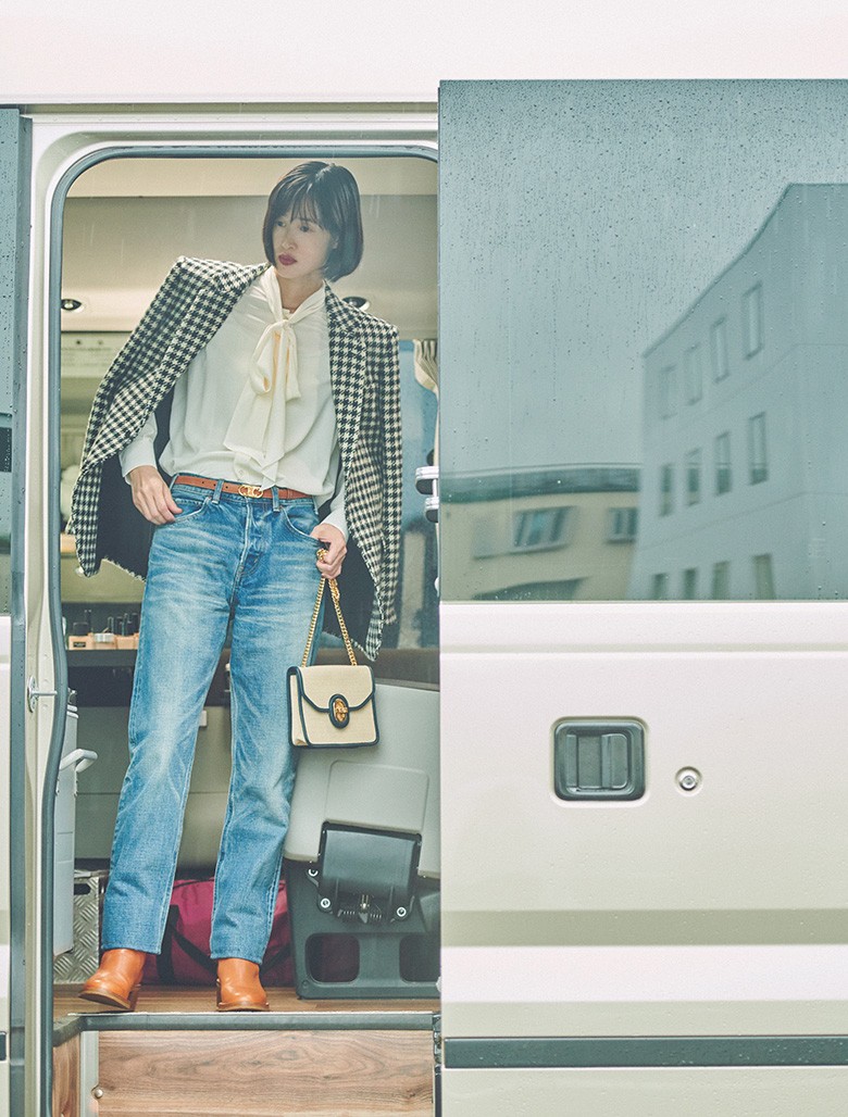 ジャケット34万1000円、シャツ参考商品、デニム10万7800円、ブーツ14万3000円、ベルト5万9400円、バッグ24万2000円[すべて予価]/すべてセリーヌ バイ エディ・スリマン(セリーヌ ジャパン 03-5414-1401)オーバーサイズな千鳥格子柄のメンズジャケットに、少し太めのデニムパンツでバランスを取って。
