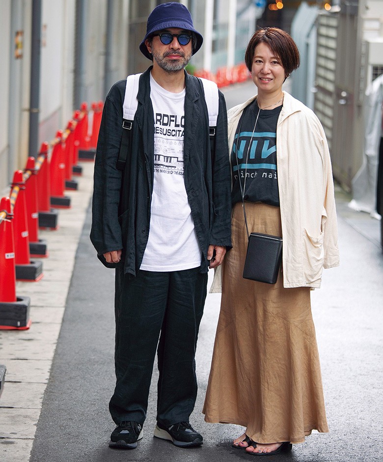 ジャケット、パンツ/ともにコモリ、Tシャツ/古着、スニーカー/ニューバランス、バッグ/メゾン マルジェラ小関祐輔さん Age 41アクセントになっている白はTシャツがドイツのアシッドハウスユニット、ハードフロアの古着で、バッグはマルジェラという驚きの振り幅!