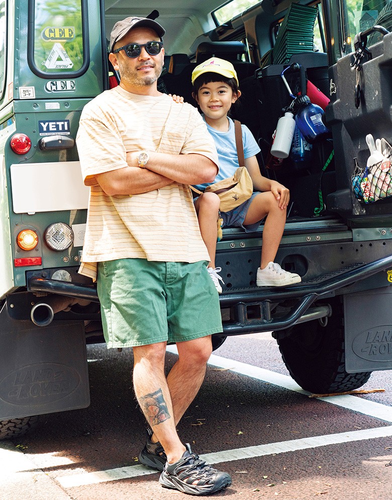 Tシャツ/イエスタデイズトゥモロウ髙橋大樹さん Age 46アクティブ派なのがよくわかる、程良くレトロなボーダー柄。四駆とショーツと愛息と、全部がしっくりハマっていて嘘がない感じがやはりイイ。優しい色合いを黒小物で引き締めて。