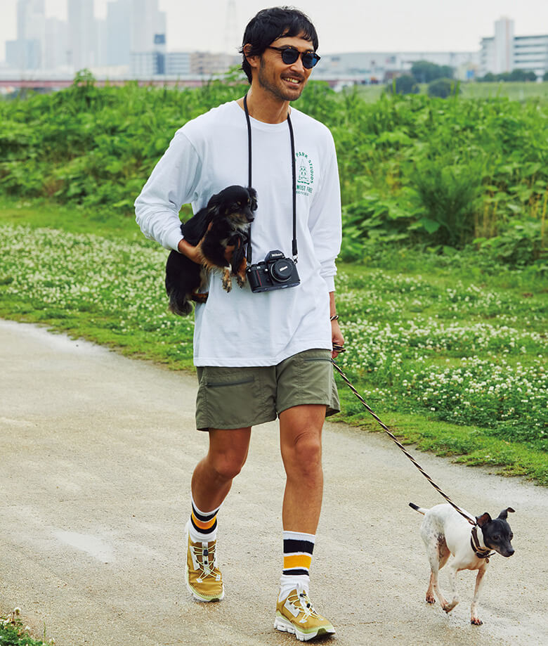 ビーガンスエードアッパーにドローコードを付けたカジュアルルックが特徴の新作は、アッパーの軽量メッシュにリサイクル素材を約85%使用。そんなサステイナブルな作りもいい。ヒールカップがないから、ペタッとフラットに持ち運び可能。ジム通いや旅で良き味方となる。当然クラウドテックも搭載。スニーカー1万6830円/オン(オン ジャパン 050-3196-4189) 、カットソー1万3750円/アーノルド パーク スタジオ(ジェットン ショールーム 03-6804-1970)、ショーツ2万5850円/バテン ウエア(アリガインターナショナル 03-6659-4126)、その他私物愛犬2匹の散歩は日課。日本テリアのショアちゃん(右)とチワックスのミミちゃん(左)は仲良しでいつも学さんの取り合いに。仕事に合わせ、朝か夕方が散歩タイム。