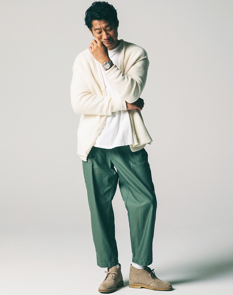 クラークスのデザートブーツをプラス。スニーカーとはひと味違う上質な雰囲気を醸し出す。