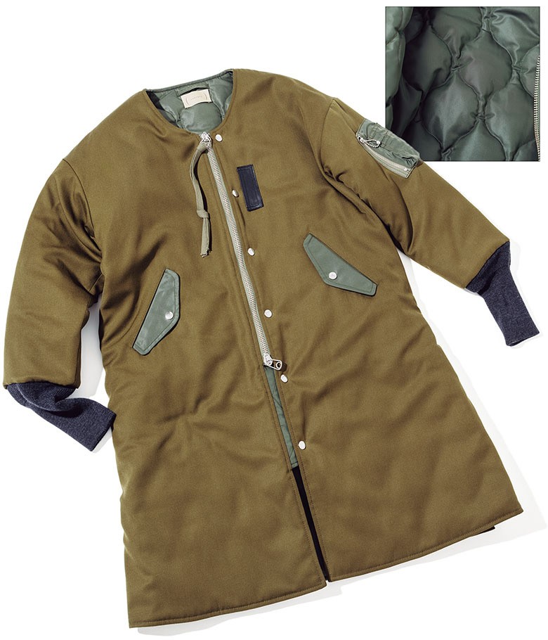 「バックサテンギャバ」。これだけでもかなりのこだわりですが、実は裏面に付けたキルティングライナーもすごいんです。ミリタリーでよく使われる、ひょうたんが連なったように見える「ミリタリーキルト」を採用。ステッチの糸も通常使用される番手より太くしています。