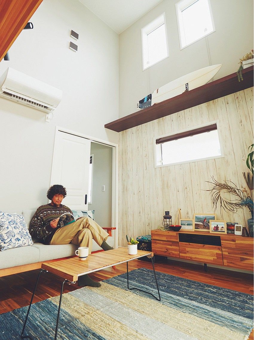 [リビングで寛ぐ男性]スウェット8800円/ヴァリゲイター(アドナスト 03-5456-5821)、ニット7590円/ティーアンドシーサーフデザインズ(エフエムワイインターナショナル 03-6421-4440)、パンツ1万9800円/オムニゴッド(オムニゴッド北堀江 06-6543-0625)、その他すべて私物