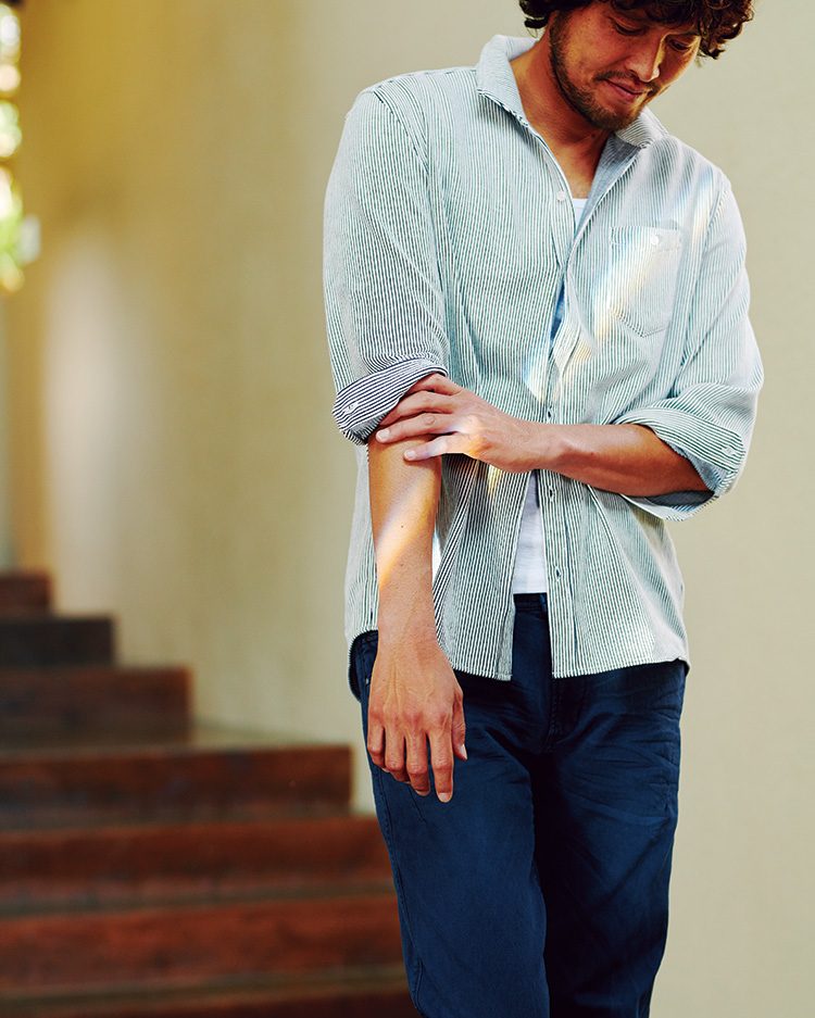 ひと捲りでサマになる7分袖や自在に立てやすいワイヤー入りの襟、さらには羽織りとしてもバランス良くキマる丈感が、簡単にこなれ感というものを出してくれる。清涼感たっぷりなストライプ柄が、無難な無地コーディネイトに変化をつけてくれるのもうれしい。ワードローブへ一点投入すれば、少しだけいつもと違う夏を迎えられるかもしれませんよ。