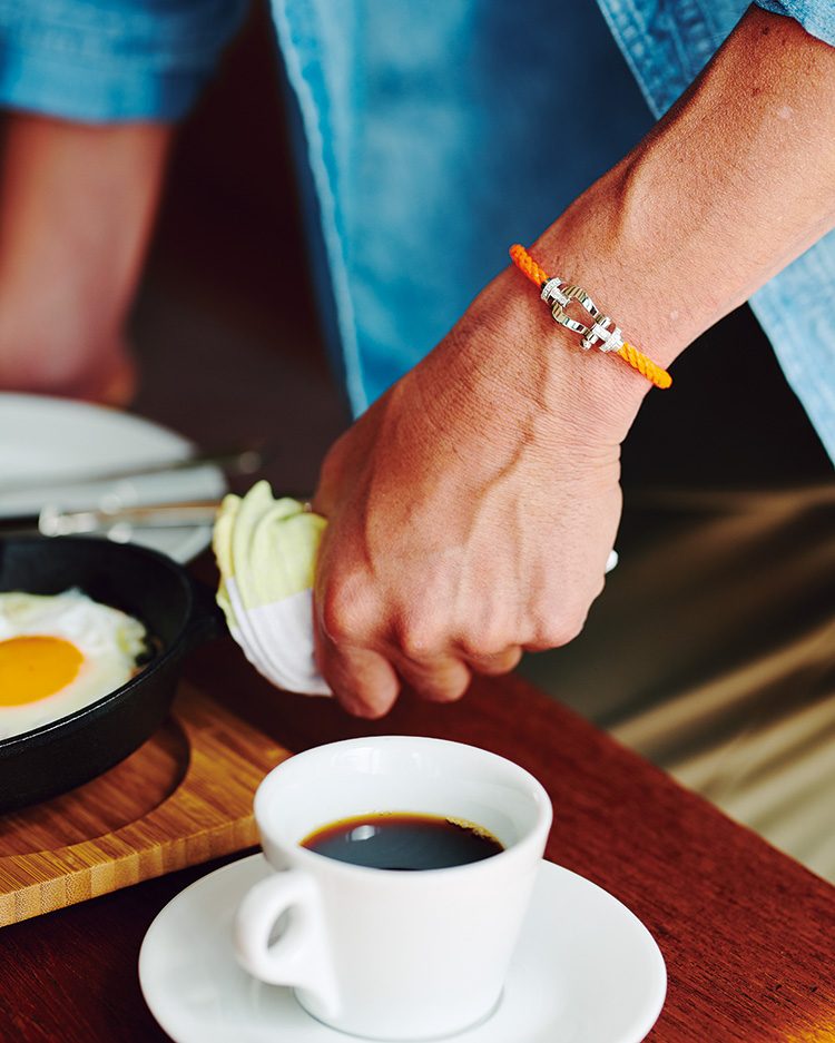 そんなポリシーを、「フォース10」のビビッドカラーのブレスレットが後押ししてくれる。さりげなくダイヤモンドがきらめくヨットのシャックルモチーフは、品格と遊びゴコロを兼ね備えている。大人好みの上質さはそのままに、親しみやすい陽気なカラーで家族ウケは上々、と。オトコとオトーチャンの境界線、これがジブンの生きる道なんだな。