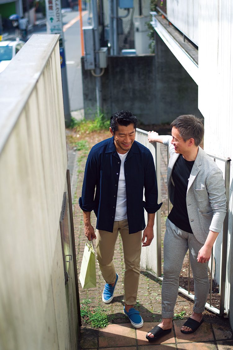 シャツ2万8000円/バグッタ(エストネーション 03-5159-7800)晴れた週末、ユースケは鎌倉にあるホウセイの自宅に招待された。海を望む高台に立つ家は幸せそうな雰囲気に包まれていた。彼の家族と食卓を囲む。しばらく忘れていた家庭の温もりが心に沁みる。ヘビロテ中の白Tと洗いざらしたネイビーのシャツ、足元はベルクロ付きのヴァンズのスリッポン。鮮やかなブルーは初夏の鎌倉の空を思わせる。
