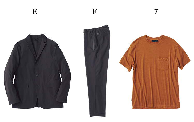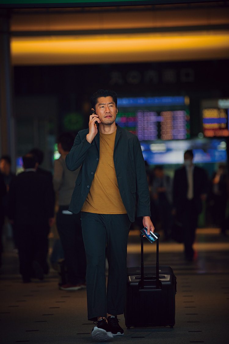 スニーカー1万5000円/ホカ オネオネ(デッカーズジャパン 0120-710-844)、スーツケース5万2000円/トゥミ 0120-006-267省庁との合同プロジェクトが大詰めを迎え、地方を飛び回る日々。そんなユースケのアドバンテージとなっているのがこのセットアップ。ストレッチと撥水性を併せ持つ素材が移動のストレスを軽減し、パッカブル機能のおかげで持ち運びも楽々。インナーに涼しいメリノウールのTシャツを選べば、盛夏の出張も恐れるに足らず。