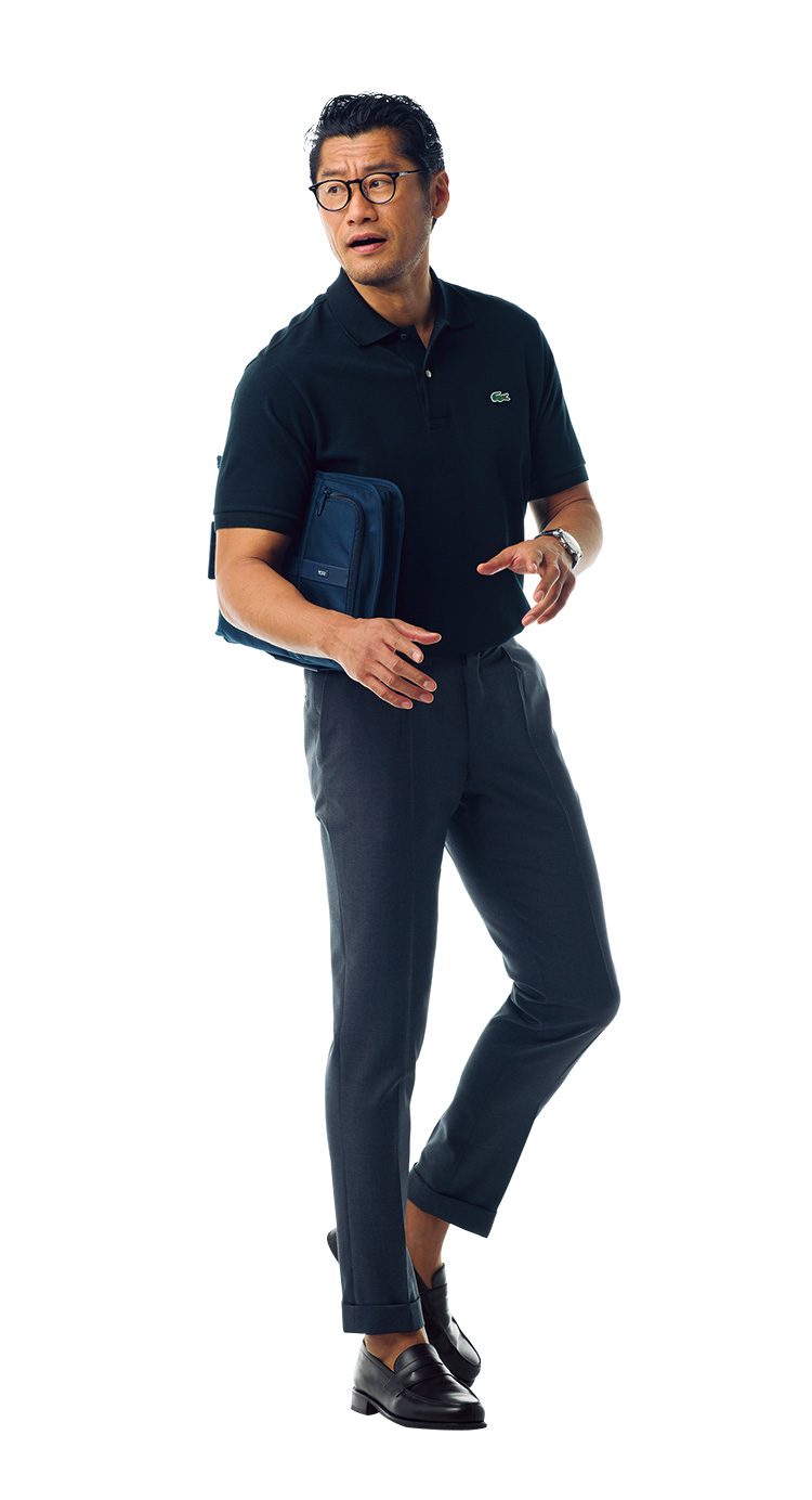 靴6万6000円/パラブーツ(パラブーツ青山店 03-5766-6688)、メガネ3万円/アヤメ 03-6455-1103、バッグ2万4000円/トゥミ フォー シップス(シップス 渋谷店)出張2日目は建設中の施設の進捗を確認。ジャケットまで着る必要はないけれど、ある程度ちゃんとした雰囲気が欲しい。そんなときユースケは迷わずラコポロを選ぶ。襟付きのデザインといい、上品な鹿の子素材といい、幅広い場面で使える大人の万能服。裾をタックインしてスラックスなんかと合わせると、きちんと感がいっそう際立つ。