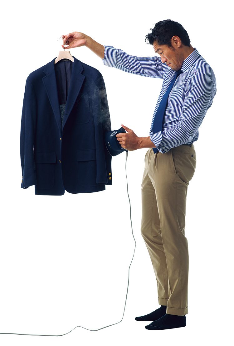 シャツ2万9000円/バルバ(ストラスブルゴ 0120-383-563)、タイ1万4700円/ブリューワー(シップス 渋谷店 03-3496-0481)、衣類スチーマー オープン価格/パナソニック 0120-878-691