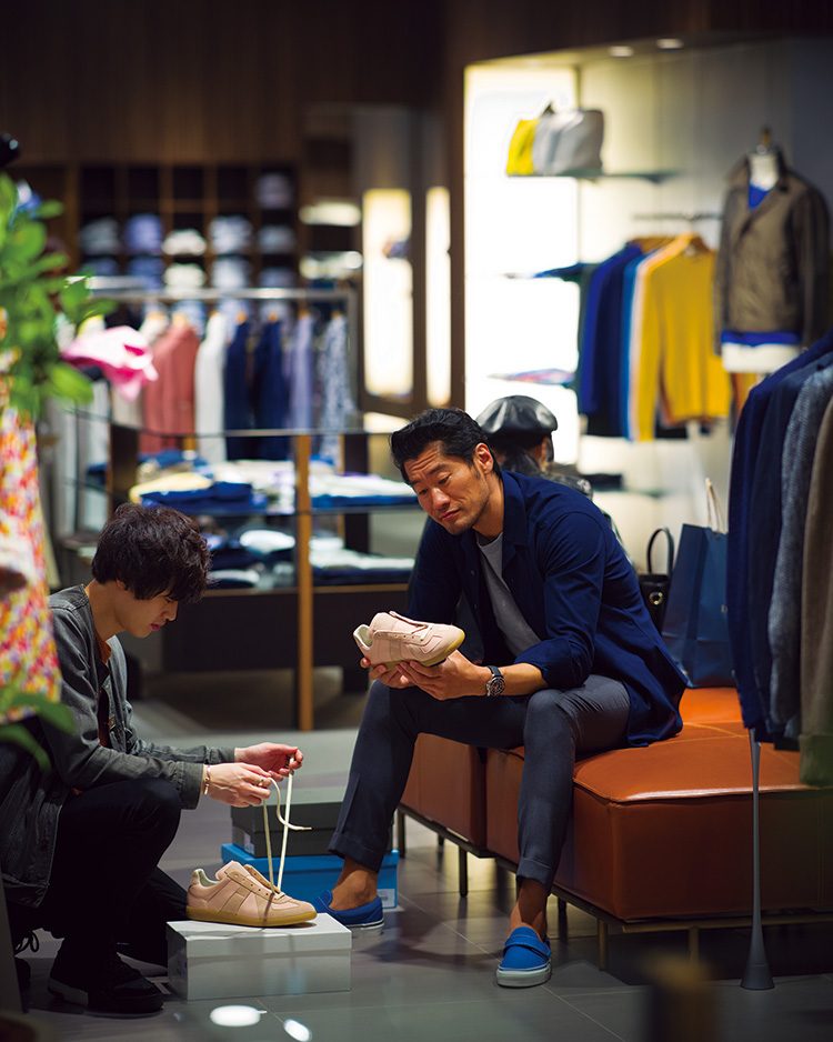 シャツ2万8000円/バグッタ(エストネーション 03-5159-7800)、腕時計37万円/ブライトリング(ブライトリング・ジャパン 03-3436-0011)、スニーカー9000円/ヴァンズ(ヴァンズ ジャパン 03-3476-5624)