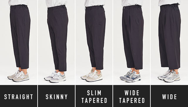 シルエットは今回もこの5種類。ワイドでもシワになりにくく、スキニーでも動きやすいのが嬉しい。スニーカーはもちろん、革靴やサンダルとの相性もバッチリ。各1万2900円前回人気だった「スリムテーパード」を筆頭に、個性の異なる5つのシルエットバリエーションは今回も健在。