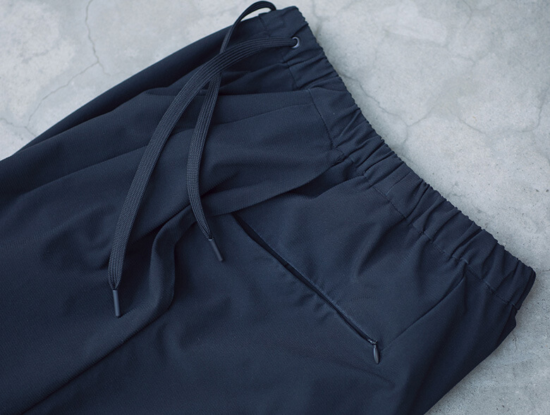 「ソロテックスというストレッチ生地を使っていて、膝も抜けないし動きやすい。もともとは航空機内で快適に過ごせるようにデザインされていて、ポケットも多く、配置も工夫されています」。夏は軽装が一番=手ぶら派の小田さん。バッグを持たずに済む収納力も手伝い、すっかり手放せなくなったという。