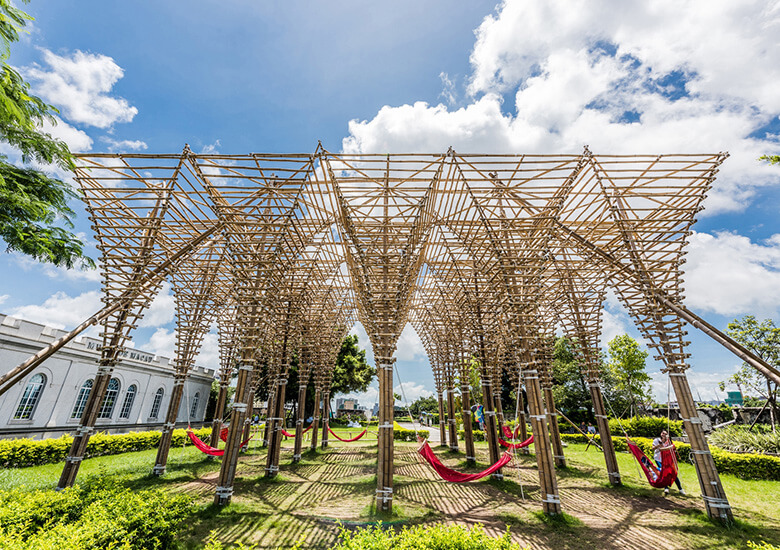 実はマカオは街全体が「マカオ歴史市街地区」として世界遺産に登録されており、その中には22の歴史的建造物と8カ所の広場が含まれるのですが、そのうちのひとつ「モンテの砦」にも作品が展示されています。世界遺産のなか、しかもマカオ市内を一望できる展望台にあるのは、João ÓとRita Machadoによる竹を使ったアート作品『Sanctuary』。こちらのインスタレーション、吊り下げられたハンモックに誰でも寝そべることができ、多くのマカオ市民がアートと触れ合う、チルな空間になっていました。