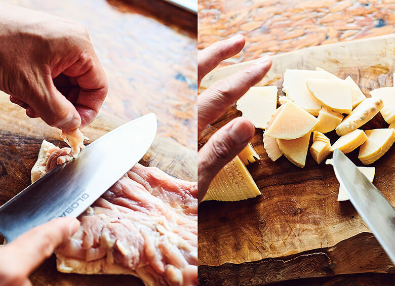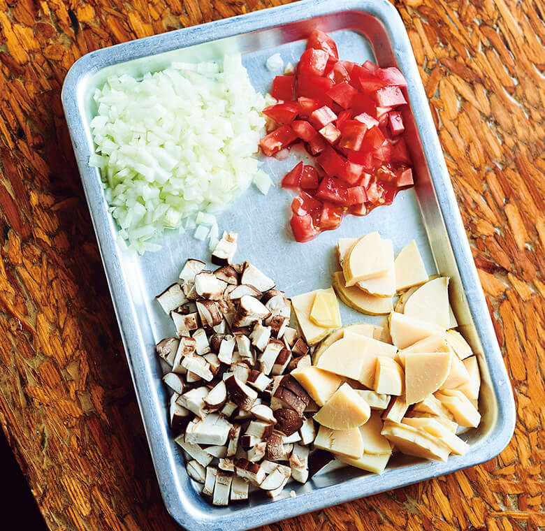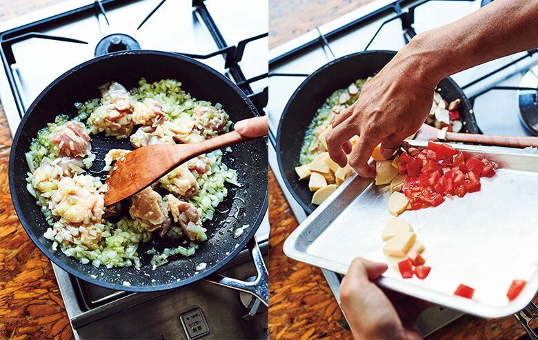 フライパンにオリーブオイルを引いて中火で熱し、玉ねぎ、にんにくを入れて炒める。香りが立ってきたら鶏もも肉を入れて炒め、ある程度火が通ったらたけのこ、しいたけ、トマトを加えて炒め合わせ、塩・こしょうを振ってさっと混ぜる。