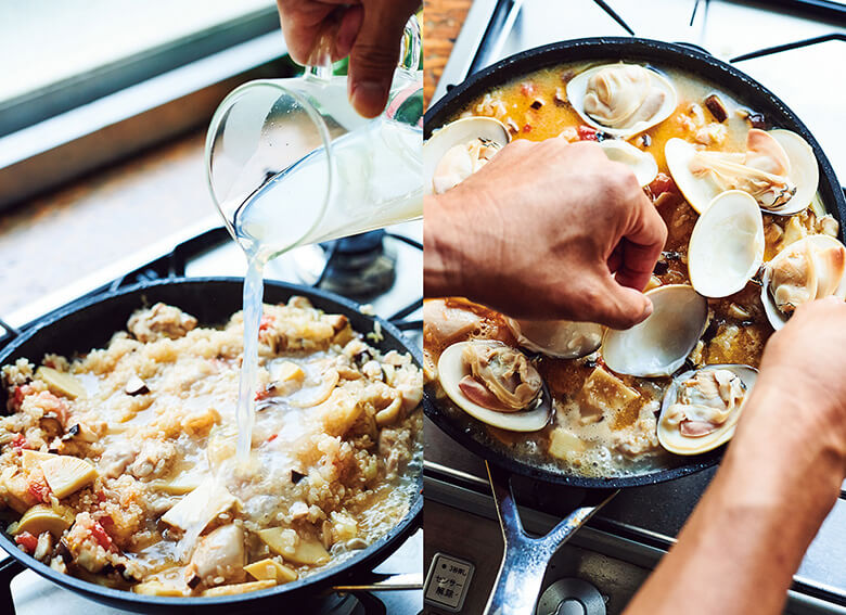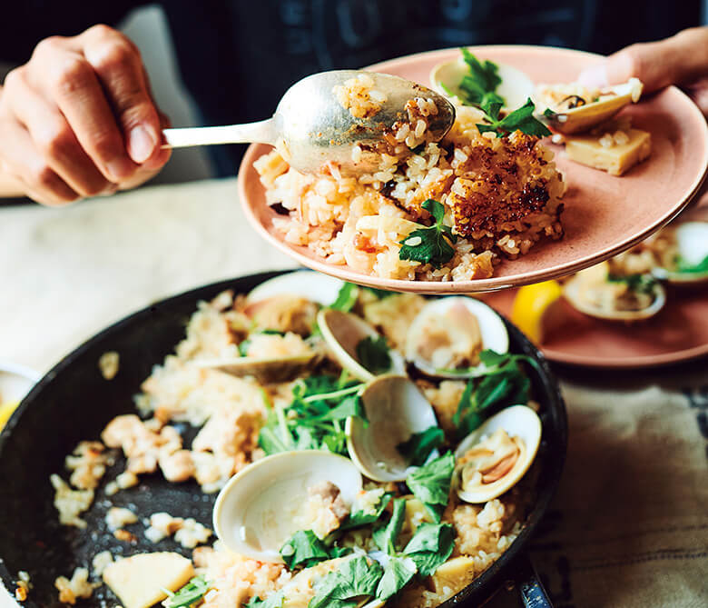 フライパンからパチパチという音が聞こえたら、もうすぐ炊きあがりの合図。さらに2分ほど炊いてから火を止めます。火を止めてそのまま10分ほど蒸らしてから蓋を取り、三つ葉を散らせば完成。お好みでレモンを搾りながら召し上がれ!
