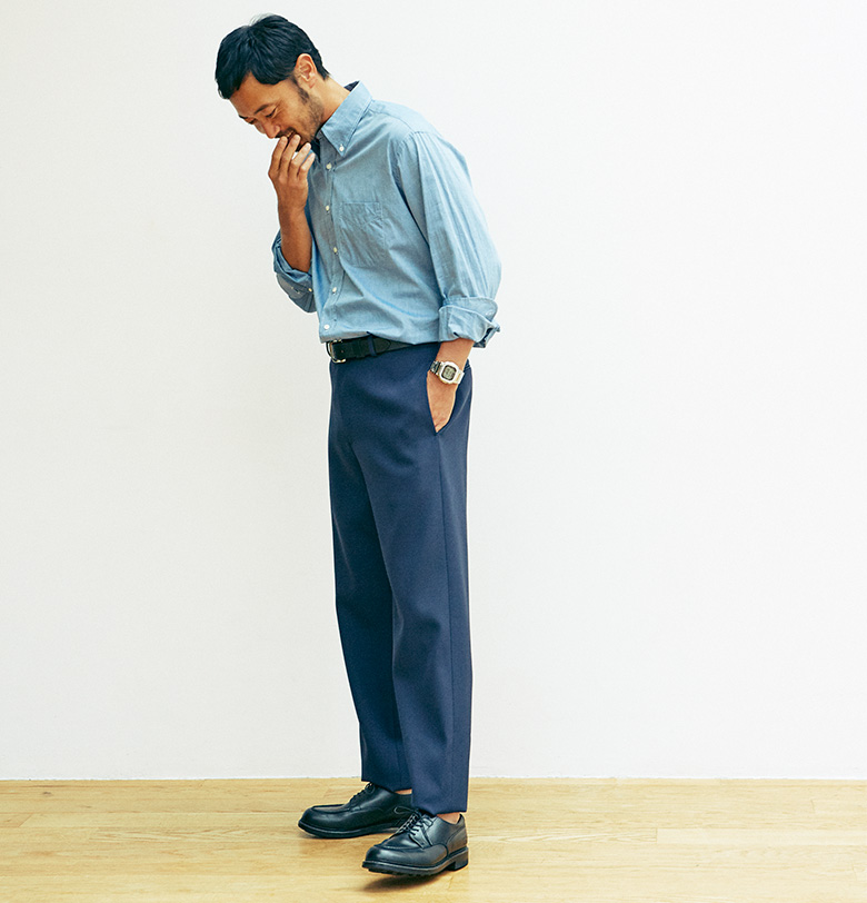 腕時計「GMW-B5000D-1JF」6万円/Gショック(カシオ計算機 https://g-shock.jp)、シャツ2万6000円/インディビジュアライズドシャツ(メイデンカンパニー 03-5410-9777)、パンツ3万9000円/エイトン(エイトン青山 03-6427-6335)、靴4万2000円/リーガル シュー&カンパニー 03-5459-3135また、重厚感あるスクリューバックケースを採用し、裏蓋には耐摩耗性を飛躍的向上させるDLCコーティングを実施。極薄の太陽電池であるフィルムソーラーセルも搭載し、時計の文字盤がまっすぐ顔に向いていなくても時刻表示が判読しやすい液晶を用いることで、視認性も向上している。