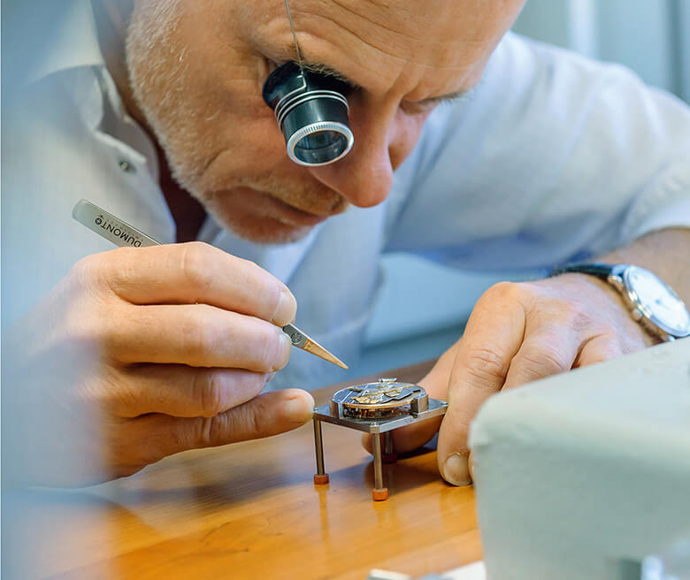 ダマスキネ技法は中国で生まれ、その後ヨーロッパへと伝播された伝統工芸。ブランパンはこの技法を腕時計に応用した先駆であり、熟練の職人たちが1本1本丁寧に製作している。まず模様をつけたい部分に溝を掘り、そこに展性の高い=薄く広がりやすい性質の24金の糸を入れ、その上からハンマーで叩き龍を作る。接着剤等をいっさい使用せず、職人の手で製作されているのだ。その姿を隠さぬよう、カットアウトされたリーフ針の佇まいも実に奥ゆかしい。