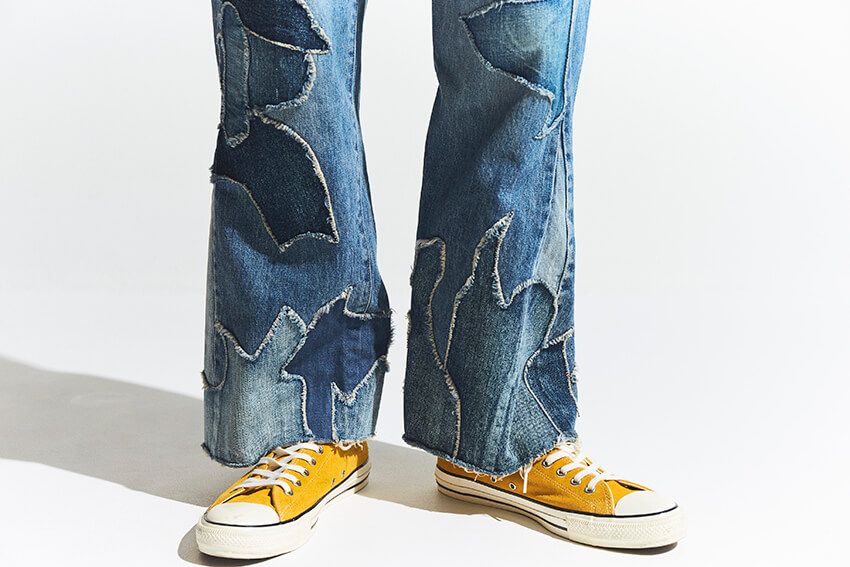 濃淡の異なるデニムのパッチワークを随所にあしらった表情は、当時の自由な空気感を想起させる。今、広い世代から支持されるレタードのスウェットにもピタリとハマる。