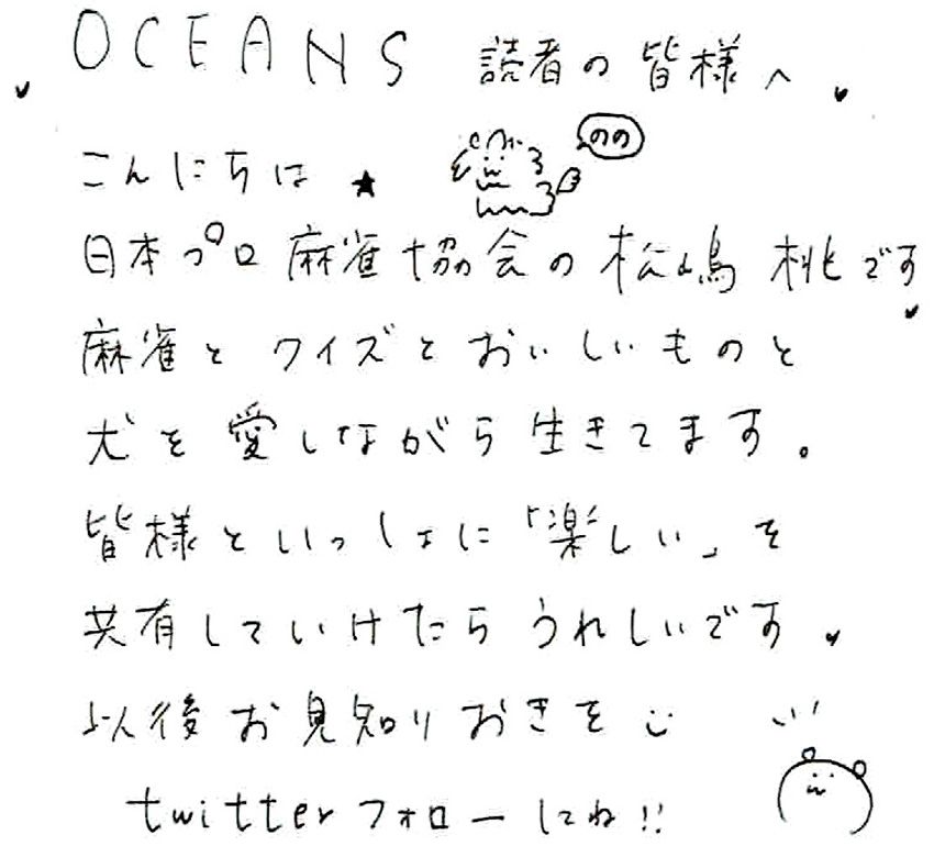 「マルチーズとトイプードルのミックス犬を飼っているんですが、なぜか散歩が嫌いでインドア派。家でその子と遊びながら麻雀動画かクイズ動画を見ながらダラダラしているときがいちばん幸せです」。