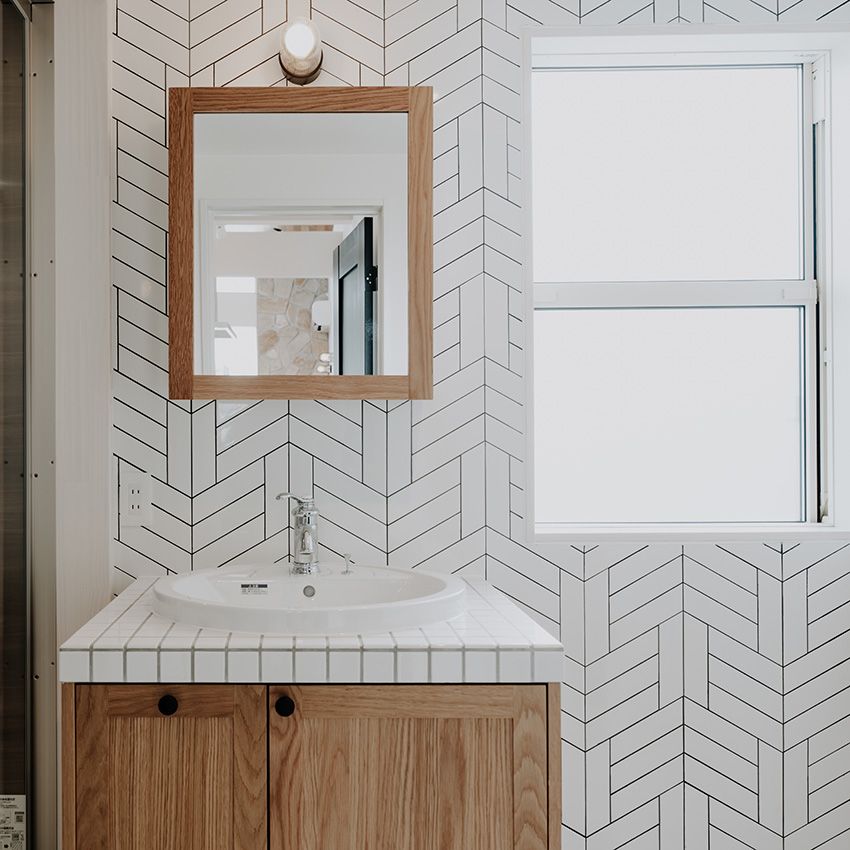 幾何学模様を配した洗面所の壁面。海辺のリゾート感が爽やかで気持ち良い。(@FLAT+)