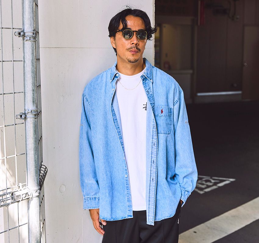 古着のラルフ ローレンのデニムシャツを主役にしたコーディネイトがこちら。