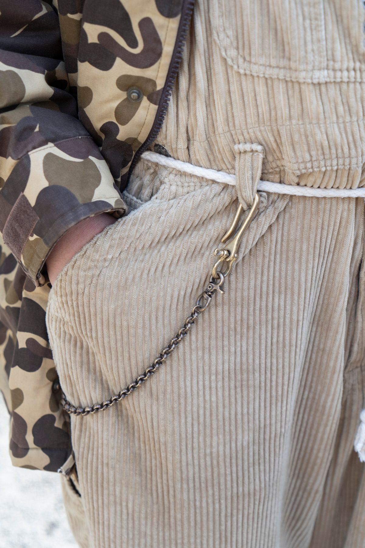 個性をふんだんに取り入れた着こなしにはシンプルなウォレットチェーンを。長年使い込まれたことがわかるチェーンは、コーデュロイの素材感ともマッチする。