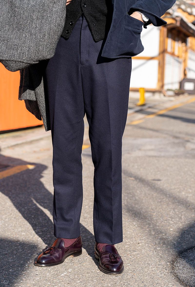 ▶︎Kimさんのスナップをすべて見るKim Hyeonjin(キム ヒョンジン)さん (34歳)絶妙に風合いの異なるネイビー地のジャケパンスタイルに、クラシカルなヘリンボーンのコートを羽織る。首元から覗くスカーフでもドレス感を演出した。