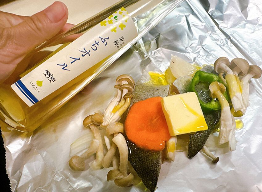 ① アルミホイルを広げて玉ねぎを敷き、その上に魚、きのこ類を乗せて最後にガーリックオイルをかけ、バターを1カケ乗せる。
