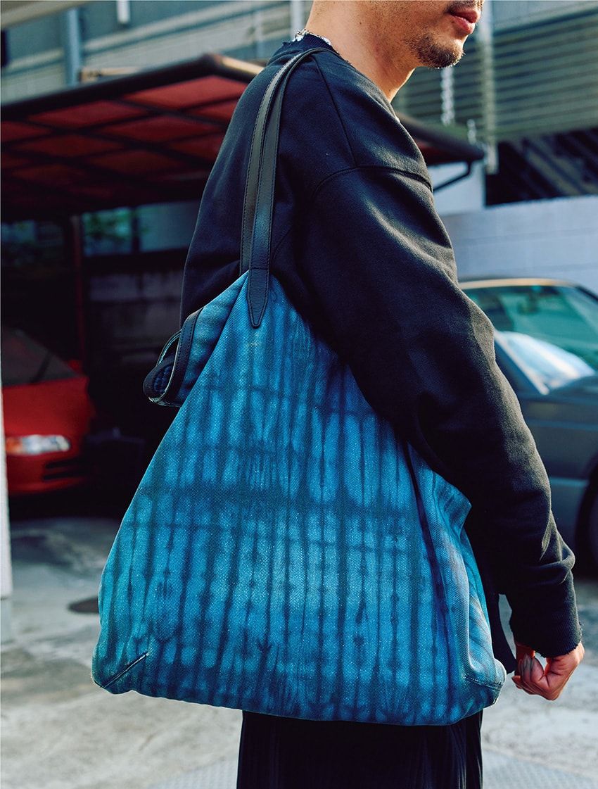 シックなオールブラックスタイルのなか、青いタイダイ染めトートが紅一点、いや“蒼一点”のアクセント。