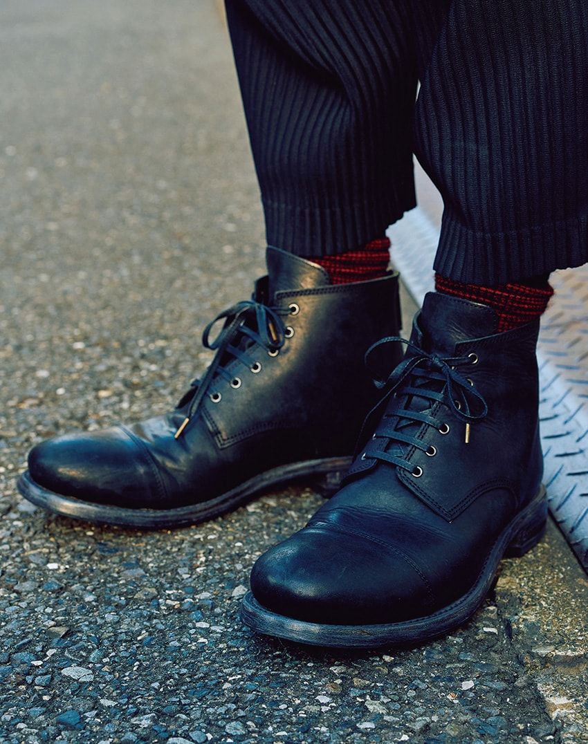 パンツとブーツはともにアンクル丈をチョイス。そのわずかな隙間に潜ませたブラック×レッドのソックスが軽妙な隠し味に。