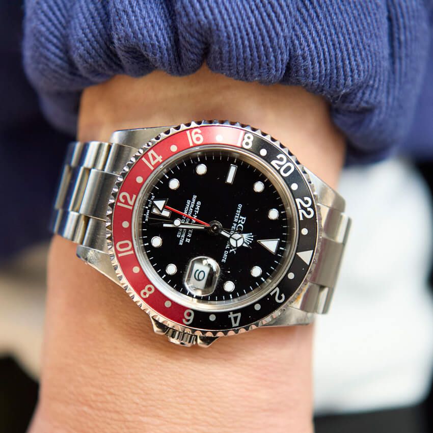 手元で存在感を放つロレックスの「GMT マスター Ⅱ」やギャルソンのリュックも、大人の風格増しにひと役買っている。