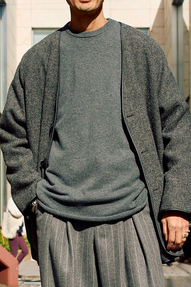 大溝 大さん(39歳)ファッショニスタがしのぎを削る激戦区、青山の地でひときわセンスが光る装いで目立っていた大溝さん。OAMCのレアなノーカラージャケットにコム デ ギャルソン・オム プリュスのウールパンツ。ガチガチモードな着こなしを良い意味でラフに見せてくれているのが、インのエクストリーム カシミアのグレーニットだ。