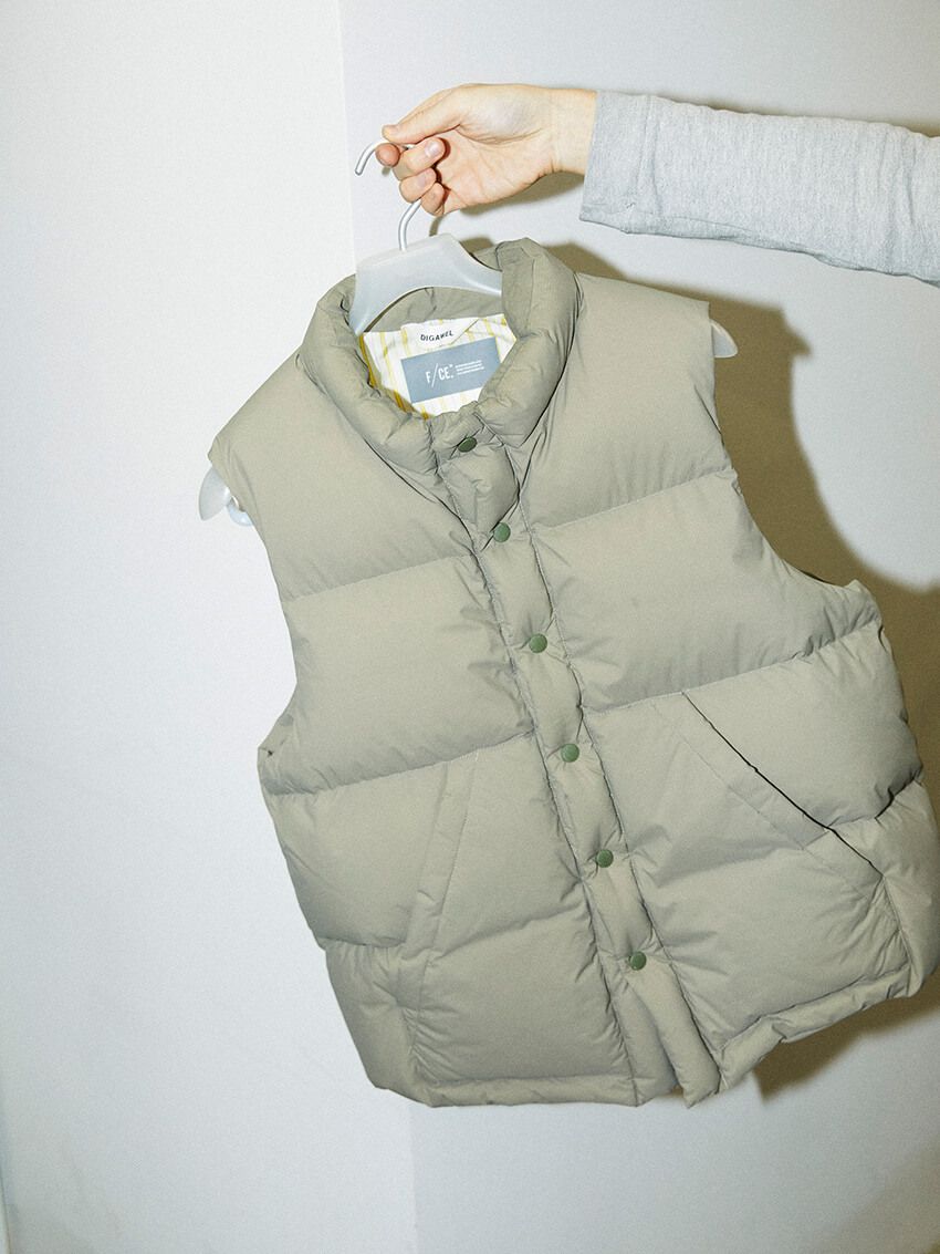 2着目もダウンだが、フーディではなくベスト。ディガウェルとF/CE.による、ジャパンブランド同士のコラボ作。モコモコとしたビジュアルが、たっぷりパッキングされた高品質ダウンの存在感をアピールする。