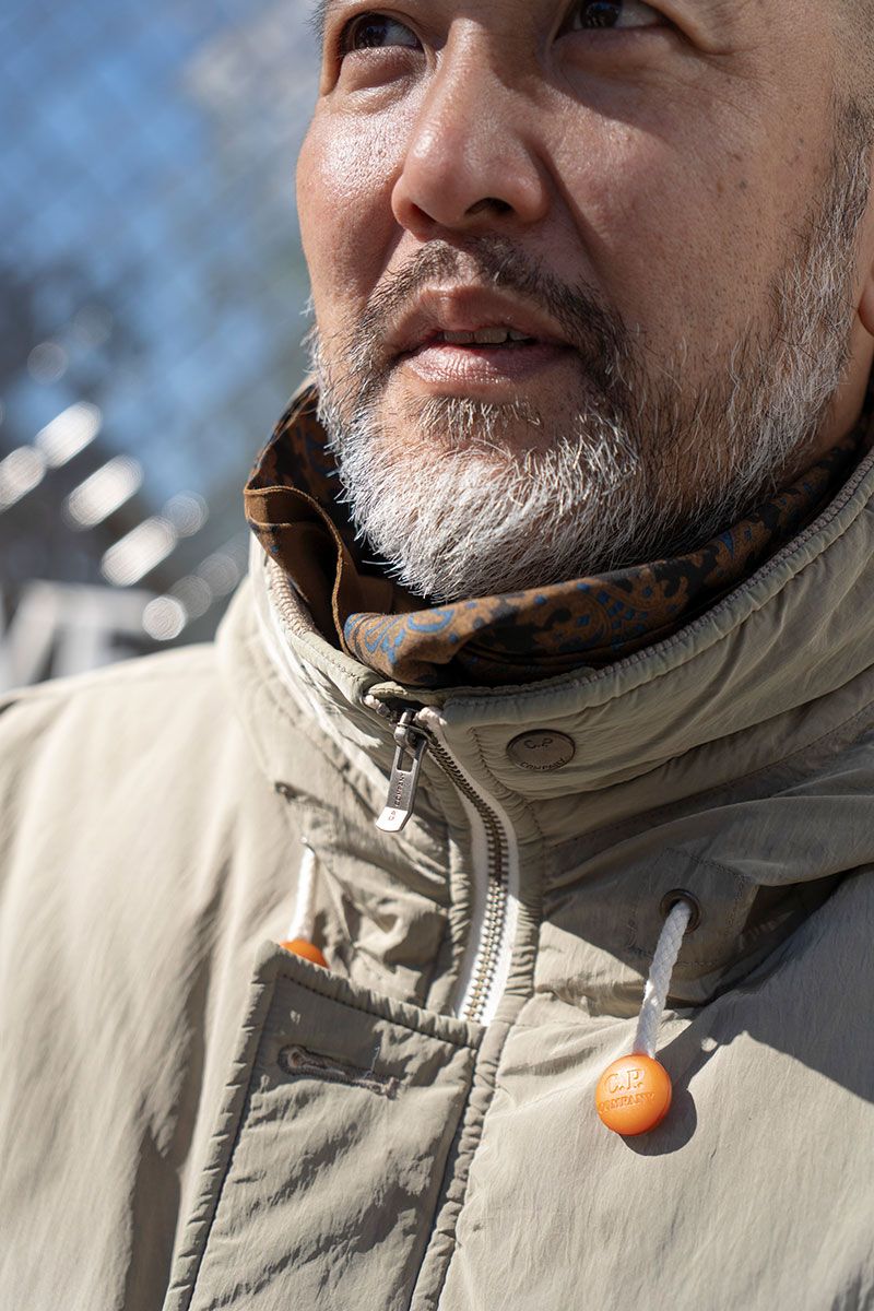 ジャケット=シーピーカンパニー スウェット=コムデギャルソン パンツ、帽子、ストール=すべて古着 シューズ=アディダス 腕時計=スウォッチ リング=ティファニー