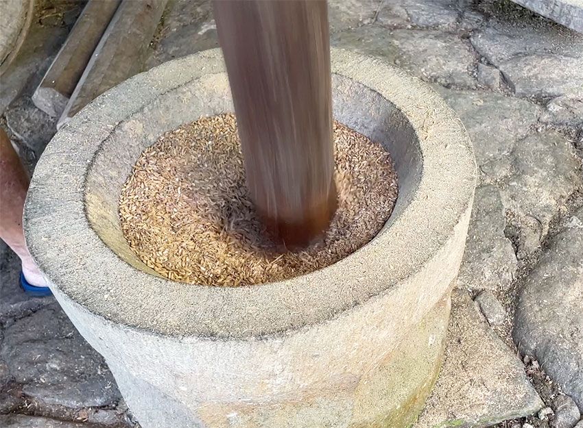 石臼に籾殻付きの米が入れられ、「ドス、ドス」と突き20分くらいで脱穀終了。重労働だなと感じましたが、主人はひと仕事終えた清々しい顔をしていました。