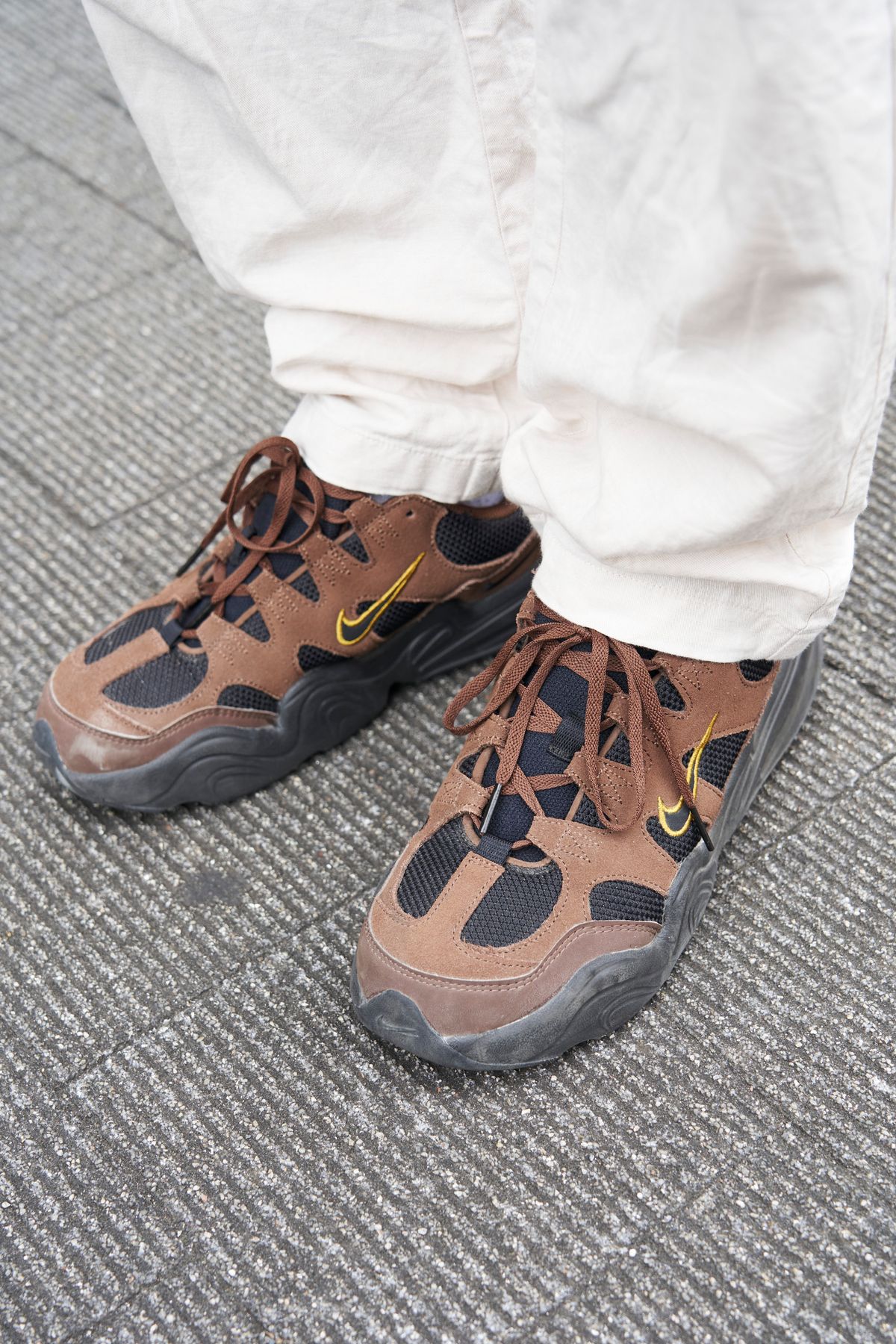 装いのアクセントになるのが、ナイキの「テック ヘラ」。厚みのある波状のミッドソールやスエードの素材感が装いのアジとなって効いてくる。