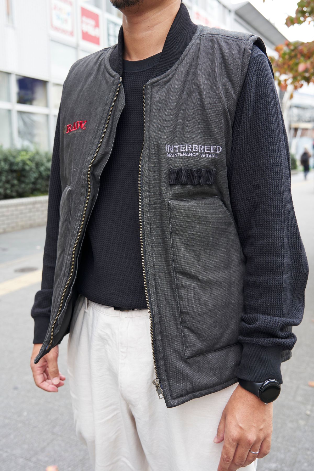 ▶︎黒木さんのスナップをすべて見る黒木さん(34歳)愛用ベストは、HIPHOPやカルチャーなどを独自の解釈でアウトプットする「インターブリード」製。ギャップのサーマルTはユニクロの白パンツにタックインして腰回りをスッキリ見せている。
