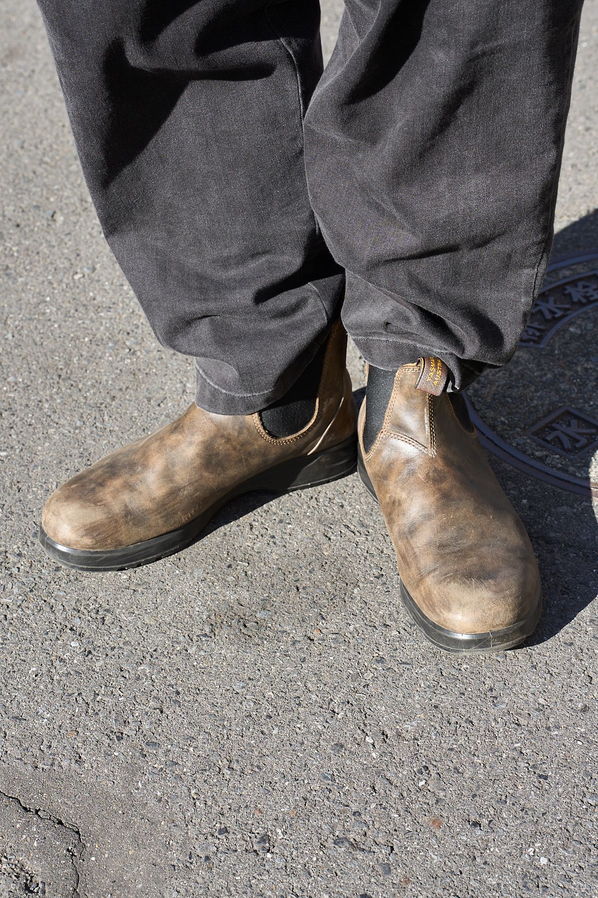 カツさんが着こなすのは、こなれ感漂う古着のブルゾン。肩の落ち方やボリュームのあるシルエットもカッコ良い。ここに合わせたのはユニクロのブラックパンツ、そしてブランドストーンだ。おそらくかなり履き込んでいるのだろう。時間の経過とともに刻まれた傷や色落ちが絶妙。ブラックコーデに“アジ”を加えている。