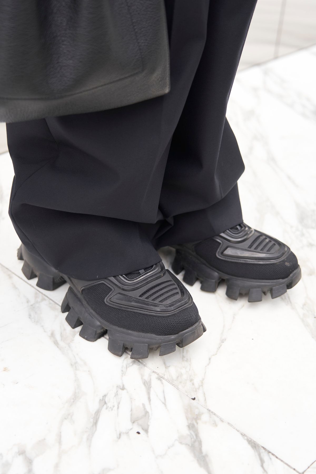 ▶︎アラエさんのスナップをすべて見るアラエさん(30歳)抜群のプロポーションに嫉妬を禁じ得ないが、そのスタイルの良さをさらに盛り上げているのが“腰上パン”である。清潔感たっぷりの青シャツに超ワイドなスラックスを合わせ、ぶかぶかの裾をプラダの厚底スニーカーが受け止める。この洗練された感性、とてもじゃないけど敵いません!