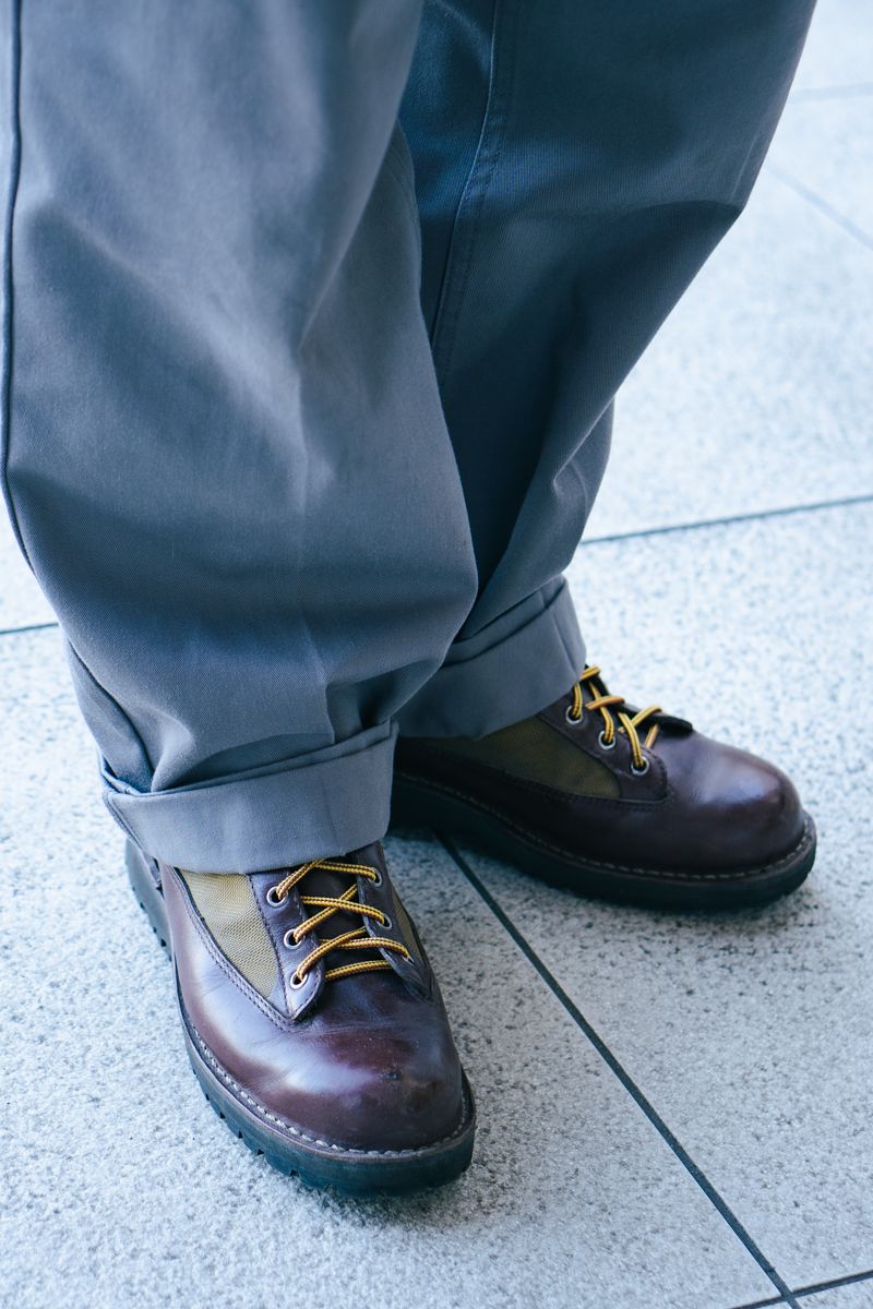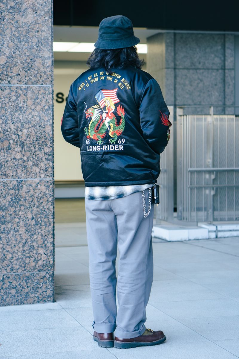 佐藤さんのスナップをすべて見る佐藤紘一郎さん(39歳)スカジャンにワイドパンツのリラックスしたアメカジスタイルに、ブラウンのダナーライトをON。ゆったりした着こなしにもバランス良くまとまっている。
