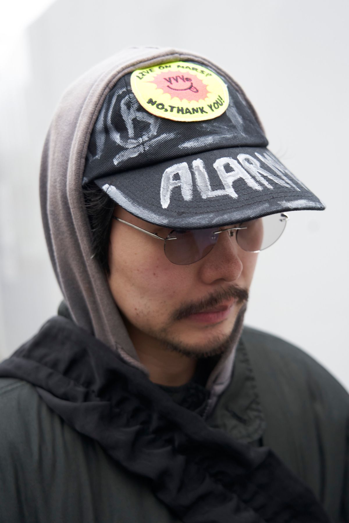 ▶︎タカヤマさんのスナップをすべて見るタカヤマさん(36歳) 全身ブラックで統一したタカヤマさん。そのコーディネイトでひときわ目を惹くのが、大衆文化や知的文化、現代アートからインスピレーションを得たフランス発のブランド「VVV」のキャップだ。