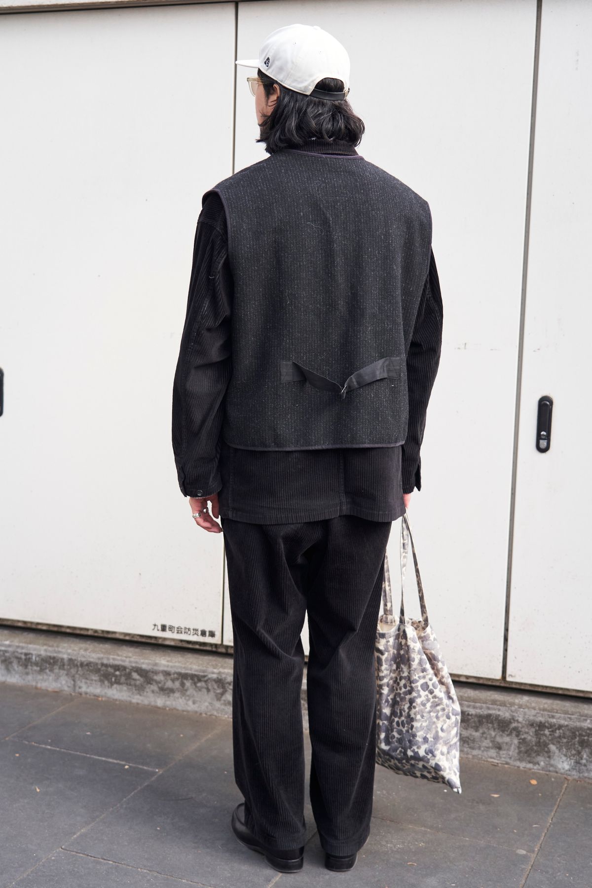 ベスト=ウールリッチ ジャケット、パンツ、ネクタイ=すべてビームス シャツ=ポロラルフローレン シューズ=フットザコーチャー 帽子=タコマフジレコード 眼鏡=金子眼鏡×ユナイテッドアローズ バッグ=アクタス 腕時計=ニクソン リング=シンズスカルプチャー