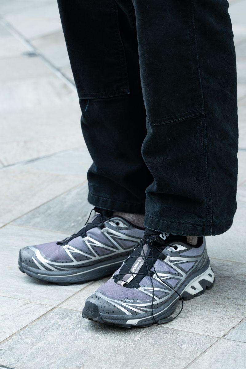 仕上げにはサロモンのハイテクスニーカーを起用。グレーとネイビーの中間のようなカラーが古着のTシャツとカラーリンク。意外にも色の使用数を抑えた、まとまりあるコーデを作り上げた。巧い。