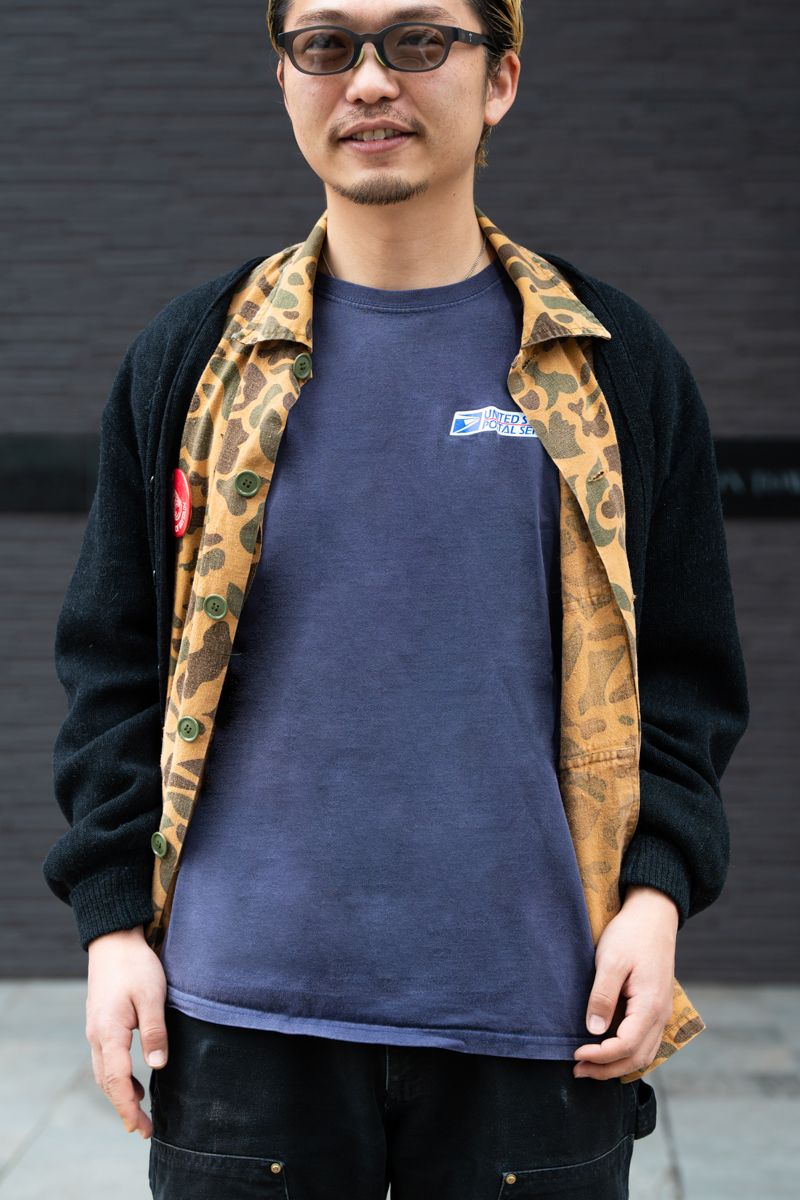 ▶︎山﨑さんのスナップをすべて見る山﨑健太さん(30歳)カーディガンにカーハートのダブルニーを合わせたブラックのワンツーコーデ。かなり個性強めなカモフラ柄のシャツも“上下ブラック効果”で懐柔し、大人らしい落ち着きを獲得した。