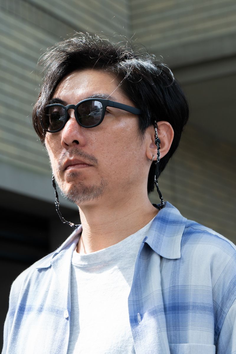 シャツ=ワコマリア パンツ=エルエルビーン シューズ=コンバースアディクト 眼鏡=ジュガードフォーティーン ブレスレット=トゥアレグ アクセサリー=エスエンダー